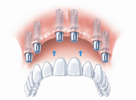 4-6 implants are placed in each jaw an aesthetic, functional bridge is fabricated over the implants. It need not be removed to clean on a daily basis and is probably the closest to natural teeth in function and aesthetics.